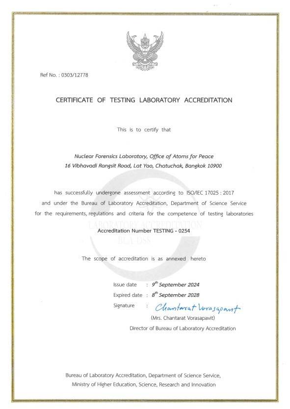 ในปี พ.ศ. 2556 สำนักงานปรมาณูเพื่อสันติ (ปส.) ดำเนินการจัดตั้งห้องปฏิบัติการตรวจพิสูจน์เอกลักษณ์ทางนิวเคลียร์ (Nuclear Forensics Laboratory)