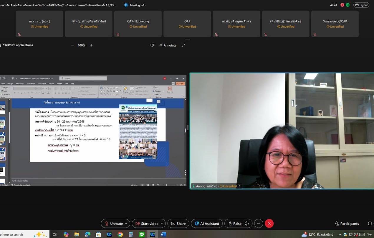 วันที่ 22 สิงหาคม 2568 สำนักงานปรมาณูเพื่อสันติ (ปส.) กระทรวงการอุดมศึกษา วิทยาศาสตร์ วิจัยและนวัตกรรม (อว.) จัดประชุมคณะอนุกรรมการเฉพาะกิจเพื่อดำเนินการวัดและเฝ้าระวังปริมาณรังสีที่ให้กับผู้ป่วยในทางการแพทย์ในประเทศไทย ครั้งที่ 3/2568 ณ ห้องประชุม 313 ปส. ผ่านระบบออนไลน์ (Webex Online) โดยมี รศ.พญ.ปานฤทัย ตรีนวรัตน์ ทำหน้าที่ประธานการประชุม ซึ่งมีระเบียบวาระสำคัญ ได้แก่ การรับรองรายงานการประชุมครั้งที่ 2/2568 และการรับทราบความคืบหน้าด้านการกำหนดค่าปริมาณรังสีอ้างอิงในการถ่ายภาพรังสีวินิจฉัยทางการแพทย (DRLs) ของประเทศไทยตั้งแต่ปี พ.ศ. 2558 – 2559 โดยกรมวิทยาศาสตร์การแพทย์และ ปส.