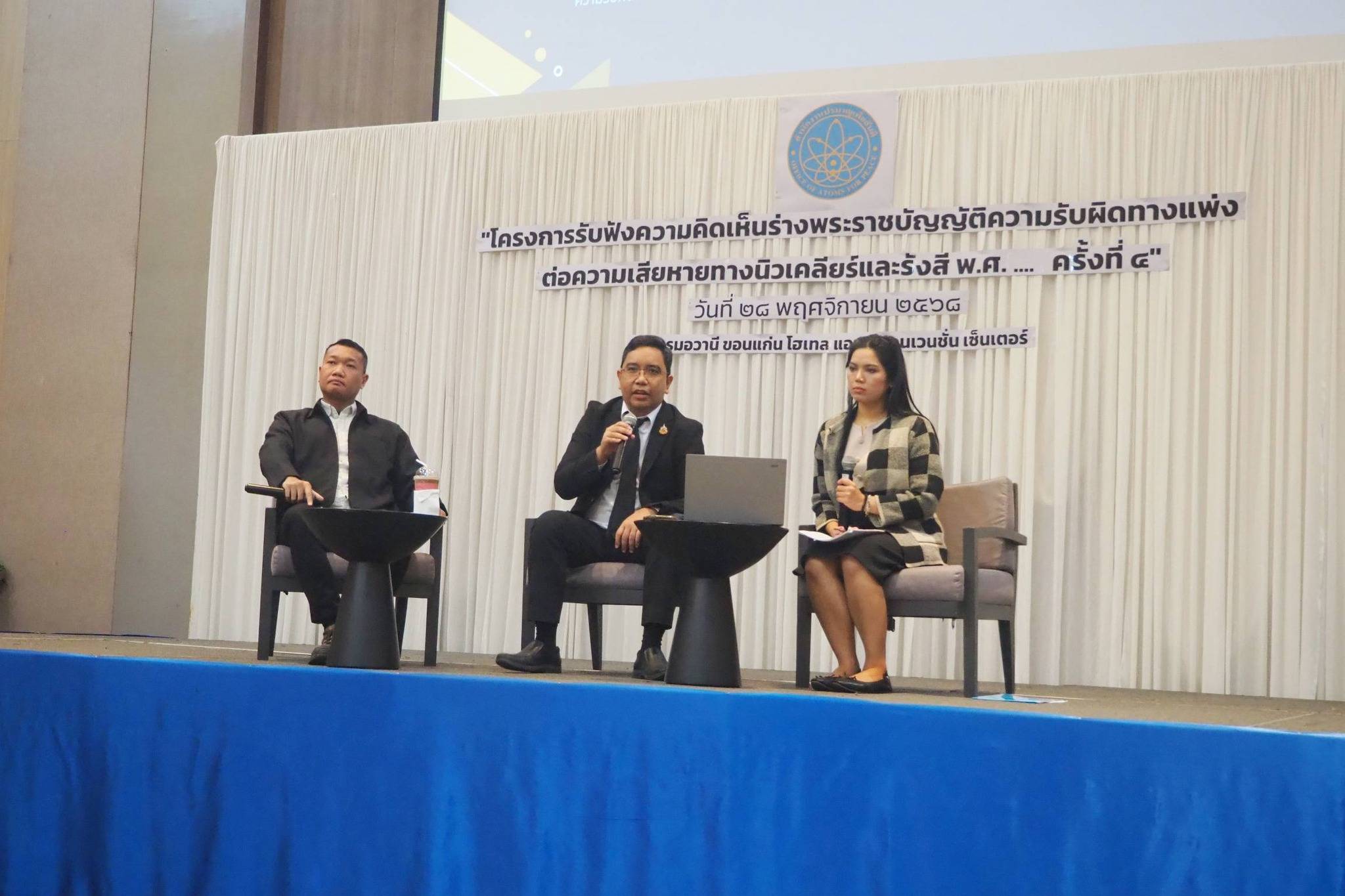 วันที่ 28 พฤศจิกายน 2568 สำนักงานปรมาณูเพื่อสันติ (ปส.) กระทรวงการอุดมศึกษา วิทยาศาสตร์ วิจัยและนวัตกรรม (อว.) จัด “โครงการรับฟังความคิดเห็นร่างพระราชบัญญัติความรับผิดทางแพ่งต่อความเสียหายทางนิวเคลียร์และรังสี พ.ศ. ….” ครั้งที่ 4 ขึ้น ณ โรงแรมอวานี ขอนแก่น โฮเทล แอนด์ คอนเวนชั่น เซ็นเตอร์ จังหวัดขอนแก่น โดยมี ดร.รุจจพัน เกตุกล่ำ ผู้อำนวยการกองพัฒนาระบบและมาตรฐานกำกับดูแลความปลอดภัย เป็นประธานในพิธีเปิด