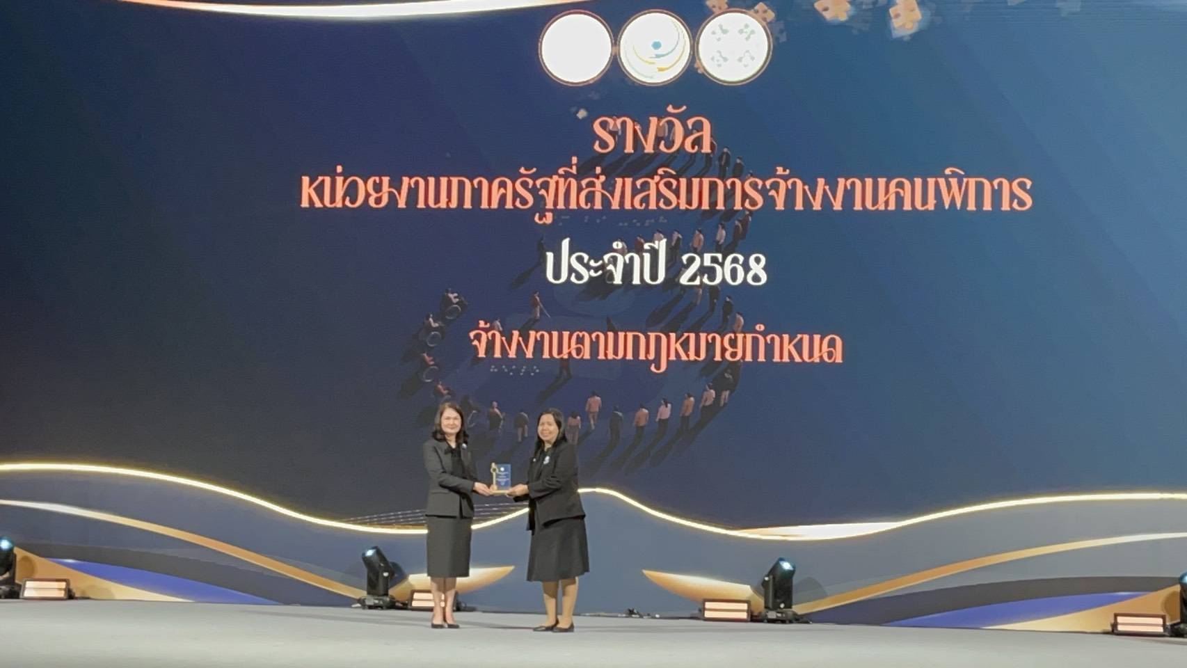 เมื่อวันที่ 3 ธันวาคม 2568 นายแพทย์รุ่งเรือง กิจผาติ อธิบดีกรมวิทยาศาสตร์บริการ รักษาราชการแทนเลขาธิการสำนักงานปรมาณูเพื่อสันติ (ปส.) กระทรวงการอุดมศึกษา วิทยาศาสตร์ วิจัยและนวัตกรรม (อว.) มอบหมายให้นางสาวชลาทิพย์ เกื้อกอบ เลขานุการกรม เป็นผู้แทนเข้ารับรางวัล “หน่วยงานภาครัฐที่ส่งเสริมการจ้างงานคนพิการ ประจำปี 2568” ภายในงานวันคนพิการสากล ณ ห้องรอยัล จูบิลี่ บอลรูม อิมแพ็ค เมืองทองธานี จังหวัดนนทบุรี ซึ่งจัดโดยกรมส่งเสริมและพัฒนาคุณภาพชีวิตคนพิการ ร่วมกับสมาคมสภาคนพิการทุกประเภทแห่งประเทศไทย องค์กรคนพิการ และภาคีเครือข่าย ภายใต้ประเด็นหลักขององค์การสหประชาชาติ “การส่งเสริมสังคมที่ครอบคลุมและเอื้อต่อคนพิการ เพื่อขับเคลื่อนความก้าวหน้าและการพัฒนาทางสังคมอย่างยั่งยืน”