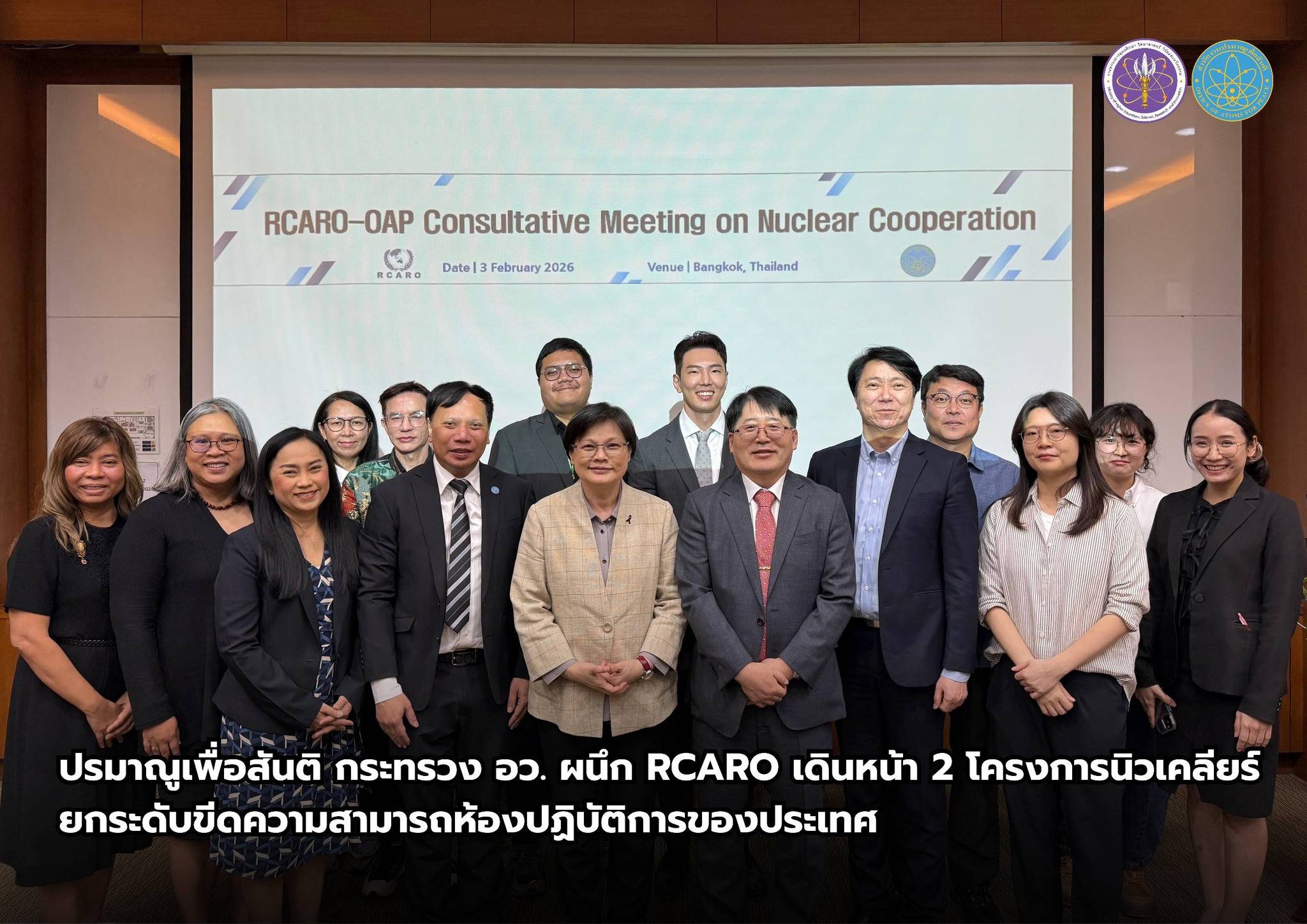 เมื่อวันที่ 3 กุมภาพันธ์ 2569 นางสาวอัมพิกา อภิชัยบุคคล รองเลขาธิการสำนักงานปรมาณูเพื่อสันติ (ปส.) กระทรวงการอุดมศึกษา วิทยาศาสตร์ วิจัยและนวัตกรรม (อว.) ในฐานะผู้ประสานงานแห่งชาติภายใต้กรอบความร่วมมือ Regional Cooperative Agreement (RCA) พร้อมด้วย ดร.วิทิต พึ่งกัน ผู้เชี่ยวชาญเฉพาะด้านการประเมินค่ากัมมันตภาพรังสี และคณะ เข้าร่วมการประชุม RCARO–OAP Consultative Meeting on Nuclear Cooperation ณ โรงแรมคอลัมน์ แบงค็อก กรุงเทพมหานคร