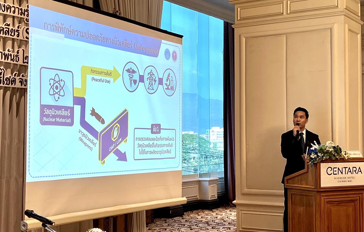 นายแพทย์รุ่งเรือง กิจผาติ อธิบดีกรมวิทยาศาสตร์บริการ และรักษาราชการแทนเลขาธิการสำนักงานปรมาณูเพื่อสันติ (ปส.) กระทรวงการอุดมศึกษา วิทยาศาสตร์ วิจัยและนวัตกรรม (อว.) ให้เกียรติเป็นประธานในพิธีเปิดการฝึกอบรมเชิงปฏิบัติการ เรื่อง “การเสริมสร้างความรู้ความเข้าใจด้านการพิทักษ์ความปลอดภัยทางนิวเคลียร์ (Safeguards) ประจำปี 2569” ในวันที่ 27 กุมภาพันธ์ 2569 ครั้งที่ 1 ณ โรงแรมเซ็นทารา ริเวอร์ไซด์ จังหวัดเชียงใหม่ โดยมีผู้บริหาร คณาจารย์ และผู้แทนจากสถาบันอุดมศึกษา ได้แก่ มหาวิทยาลัยเชียงใหม่ มหาวิทยาลัยแม่โจ้ มหาวิทยาลัยแม่ฟ้าหลวง มหาวิทยาลัยนเรศวร มหาวิทยาลัยพะเยา มหาวิทยาลัยราชภัฏเชียงใหม่ มหาวิทยาลัยเทคโนโลยีราชมงคลล้านนา และศูนย์ความเป็นเลิศด้านฟิสิกส์ เข้าร่วมการฝึกอบรม เพื่อเสริมสร้างความรู้ความเข้าใจและความร่วมมือด้านการกำกับดูแลทางนิวเคลียร์และรังสีของประเทศ