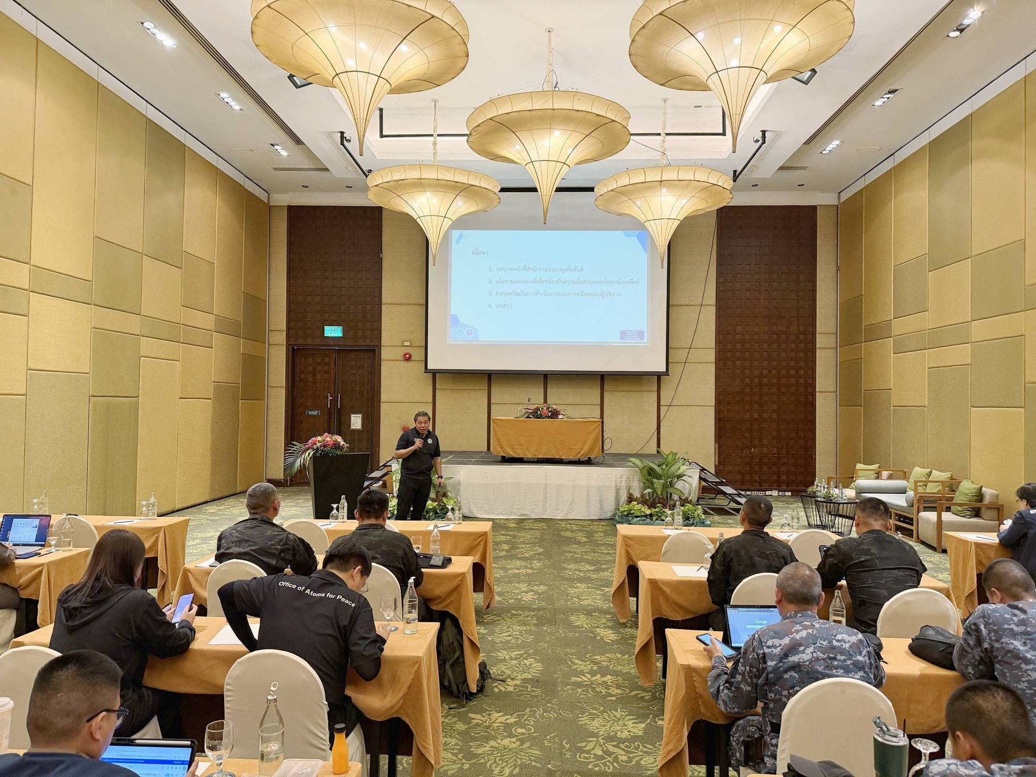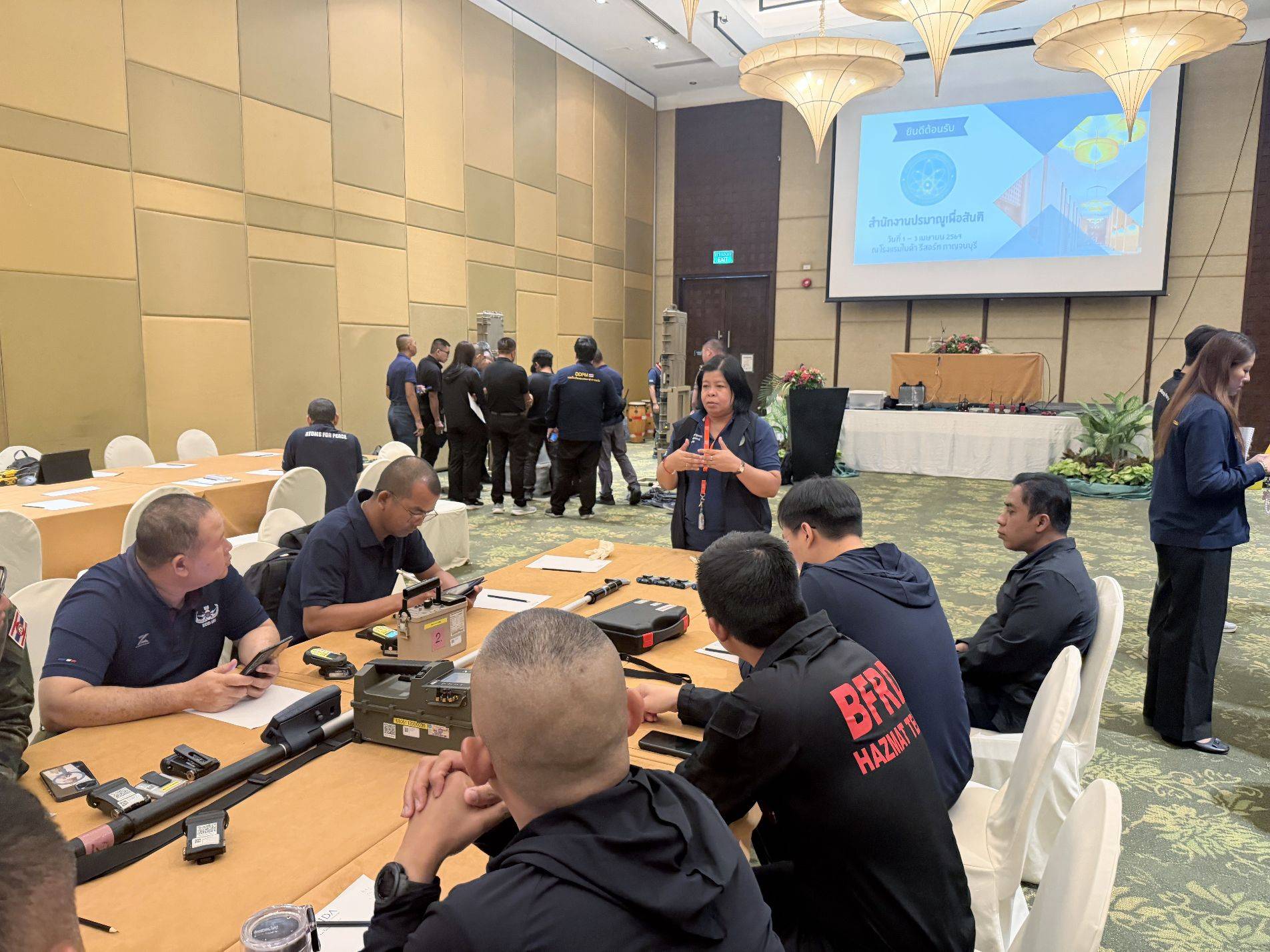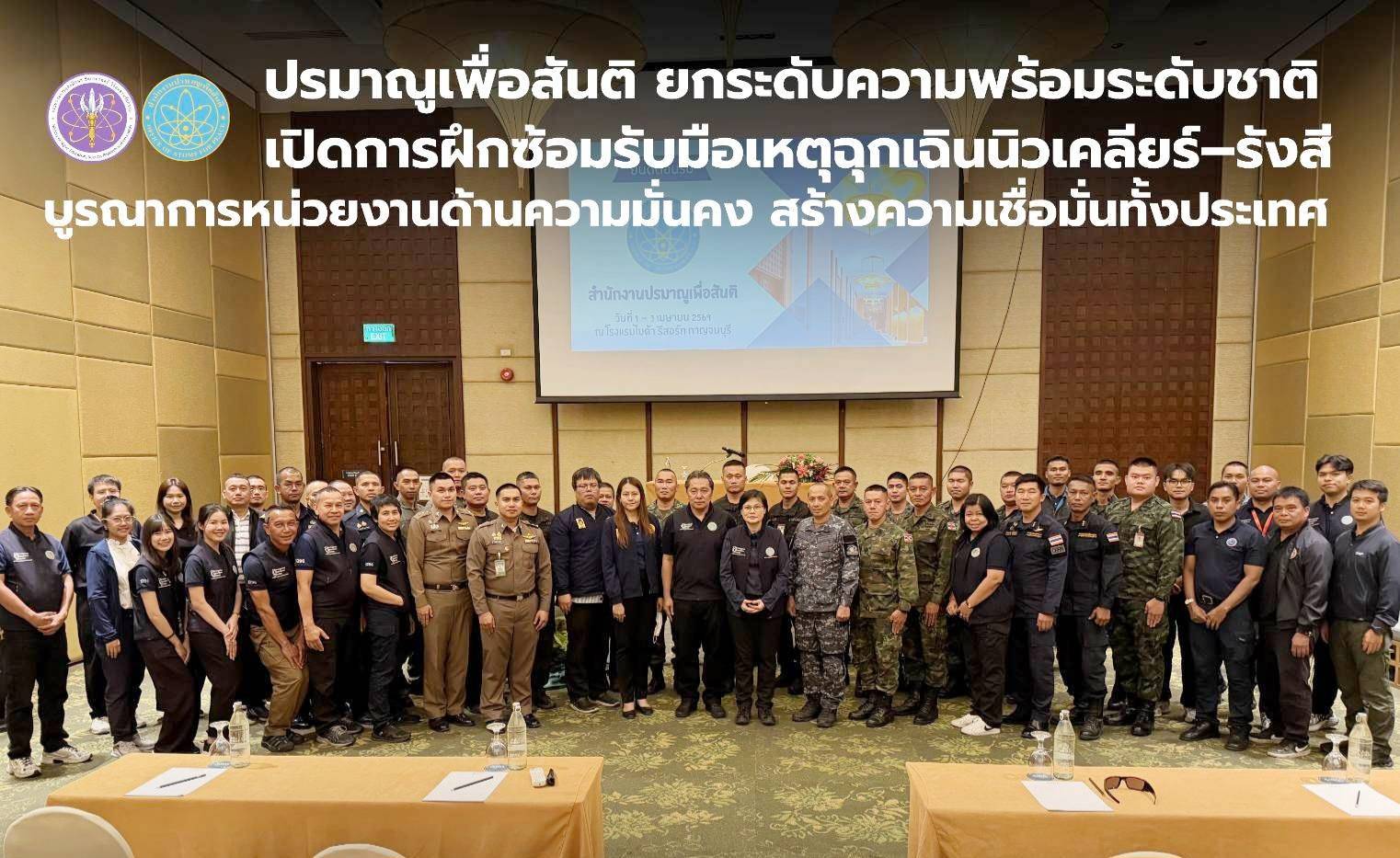 นายแพทย์รุ่งเรือง กิจผาติ อธิบดีกรมวิทยาศาสตร์บริหาร และรักษาราชการแทนเลขาธิการสำนักงานปรมาณูเพื่อสันติ (ปส.) กระทรวงการอุดมศึกษา วิทยาศาสตร์ วิจัยและนวัตกรรม (อว.) มอบหมายให้นางสาวอัมพิกา อภิชัยบุคคล รองเลขาธิการ ปส. เสริมทัพเจ้าหน้าที่เผชิญเหตุ ฝึกอบรมและฝึกซ้อมการตอบสนองเหตุฉุกเฉินทางนิวเคลียร์และรังสี และการตอบสนองต่อเหตุด้านความมั่นคงปลอดภัยทางนิวเคลียร์และรังสี ให้กับหน่วยงานด้านความมั่นคง ระหว่างวันที่ 1 – 3 เมษายน 2569 ณ โรงแรมไมด้า รีสอร์ท กาญจนบุรี จังหวัดกาญจนบุรี เพื่อเสริมสร้างความรู้ ความเข้าใจ และยกระดับความพร้อมของหน่วยงานและเจ้าหน้าที่ที่เกี่ยวข้องในการรับมือเหตุฉุกเฉินทางนิวเคลียร์และรังสี ทั้งด้านการประสานงาน การประเมินสถานการณ์ การสื่อสารในภาวะวิกฤต ตลอดจนการควบคุมและบรรเทาผลกระทบที่อาจเกิดขึ้นต่อประชาชนและสิ่งแวดล้อม