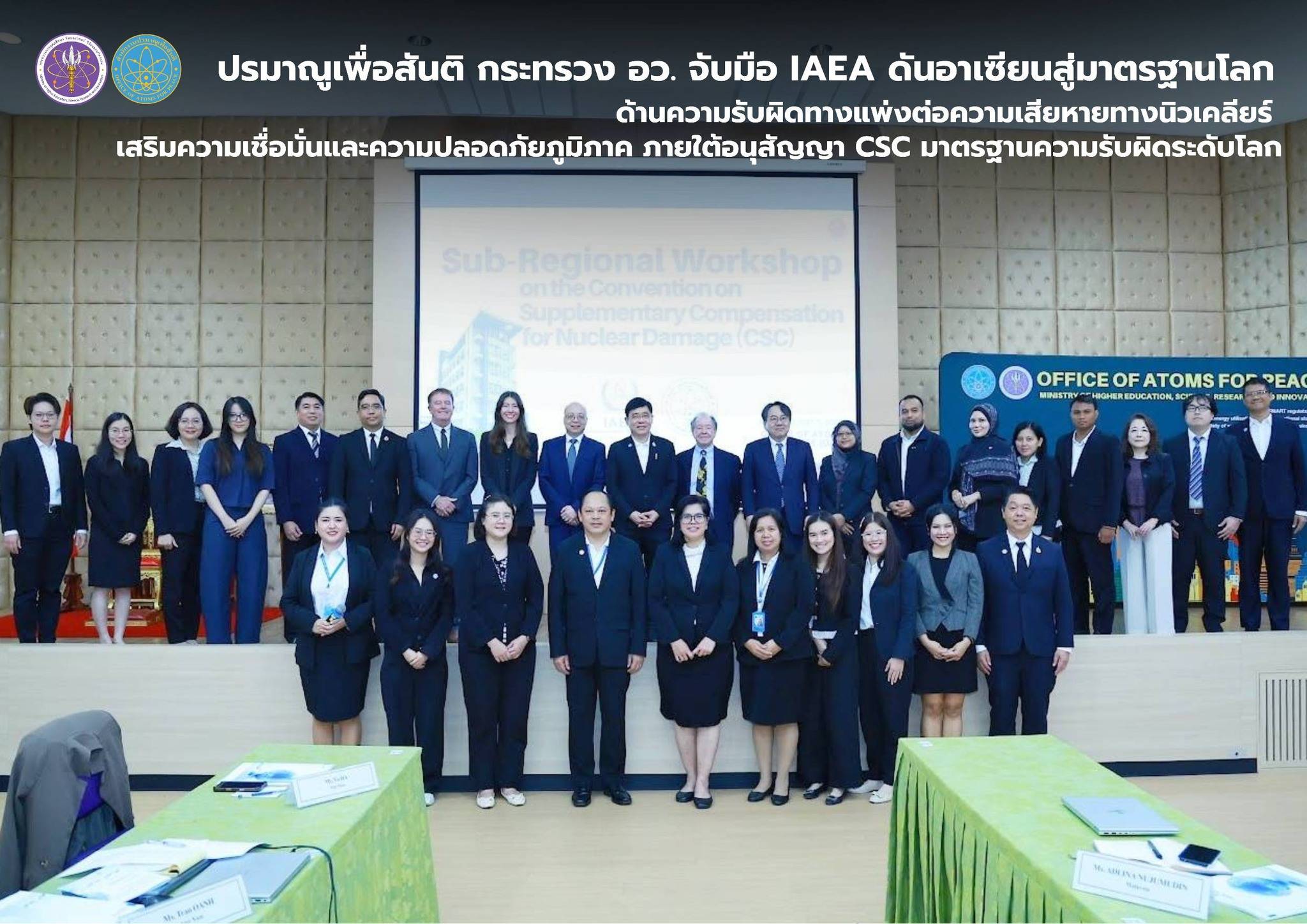 Dr. Rungreung Kitphati, Director-General of the Department of Science Service and Acting Secretary-General of the Office of Atoms for Peace (OAP), presided over the opening of a subregional workshop on the Convention on Supplementary Compensation for Nuclear Damage (CSC). The event, co-organized by OAP and the International Atomic Energy Agency (IAEA), was held on 2–3 December 2025 at OAP Headquarters with participants from six ASEAN member states: Brunei Darussalam, Indonesia, Malaysia, the Philippines, Singapore, and Vietnam.