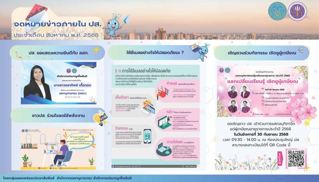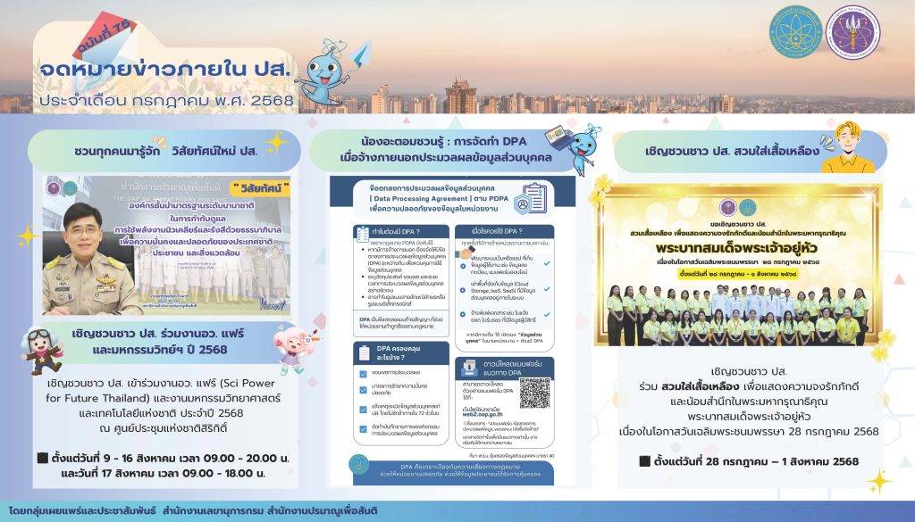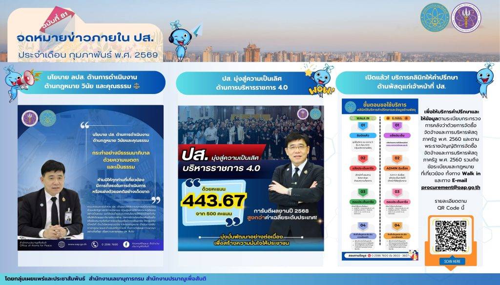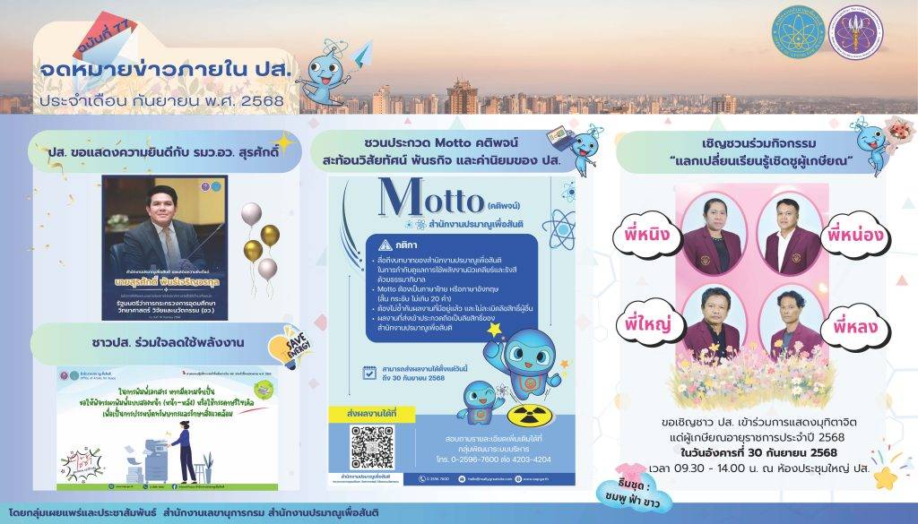 Homeเอกสารเผยแพร่จดหมายข่าวจดหมายข่าวปรมาณูเพื่อสันติ จดหมายข่าว จดหมายข่าวภายใน ปส. Search for:Search Button จดหมายข่าวภายใน ปส. ประจำเดือน กุมภาพันธ์ พ.ศ. 2569 2 มีนาคม 2569 จดหมายข่าวภายใน ปส. ประจำเดือน มกราคม พ.ศ. 2569 27 มกราคม 2569 จดหมายข่าวภายใน ปส. ประจำเดือน พฤศจิกายน พ.ศ. 2568 28 พฤศจิกายน 2568 จดหมายข่าวภายใน ปส. ประจำเดือน ตุลาคม พ.ศ. 2568 31 ตุลาคม 2568 จดหมายข่าวภายใน ปส. ประจำเดือน กันยายน พ.ศ. 2568 26 กันยายน 2568 จดหมายข่าวภายใน ปส. ประจำเดือน สิงหาคม พ.ศ. 2568 28 สิงหาคม 2568 จดหมายข่าวภายใน ปส. ประจำเดือน กรกฎาคม พ.ศ. 2568 1 สิงหาคม 2568 จดหมายข่าวภายใน ปส. ประจำเดือน มิถุนายน พ.ศ. 2568 30 มิถุนายน 2568 จดหมายข่าวภายใน ปส. ประจำเดือน พฤษภาคม พ.ศ. 2568 26 พฤษภาคม 2568 จดหมายข่าวภายใน ปส. ประจำเดือน เมษายน พ.ศ. 2568 30 เมษายน 2568 จดหมายข่าวภายใน ปส. ประจำเดือน มีนาคม พ.ศ. 2568 31 มีนาคม 2568 จดหมายข่าวภายใน ปส. ประจำเดือน กุมภาพันธ์ พ.ศ. 2568 27 กุมภาพันธ์ 2568 1 2 3 Next » กลุ่มมาตรฐานการวัดทางนิวเคลียร์และรังสี กลุ่มเฝ้าตรวจกัมมันตภาพรังสี กลุ่มประเมินค่าปริมาณรังสี กลุ่มพัฒนาด้านความปลอดภัย กลุ่มสนับสนุนทางเทคนิคด้านความมั่นคงและพิทักษ์ความปลอดภัย กลุ่มเลขานุการคณะกรรมการพลังงานนิวเคลียร์เพื่อสันติ ศูนย์ปรมาณูเพื่อสันติภูมิภาค จดหมายข่าวปรมาณูเพื่อสันติ สรุปข่าวเด่นประจำสัปดาห์