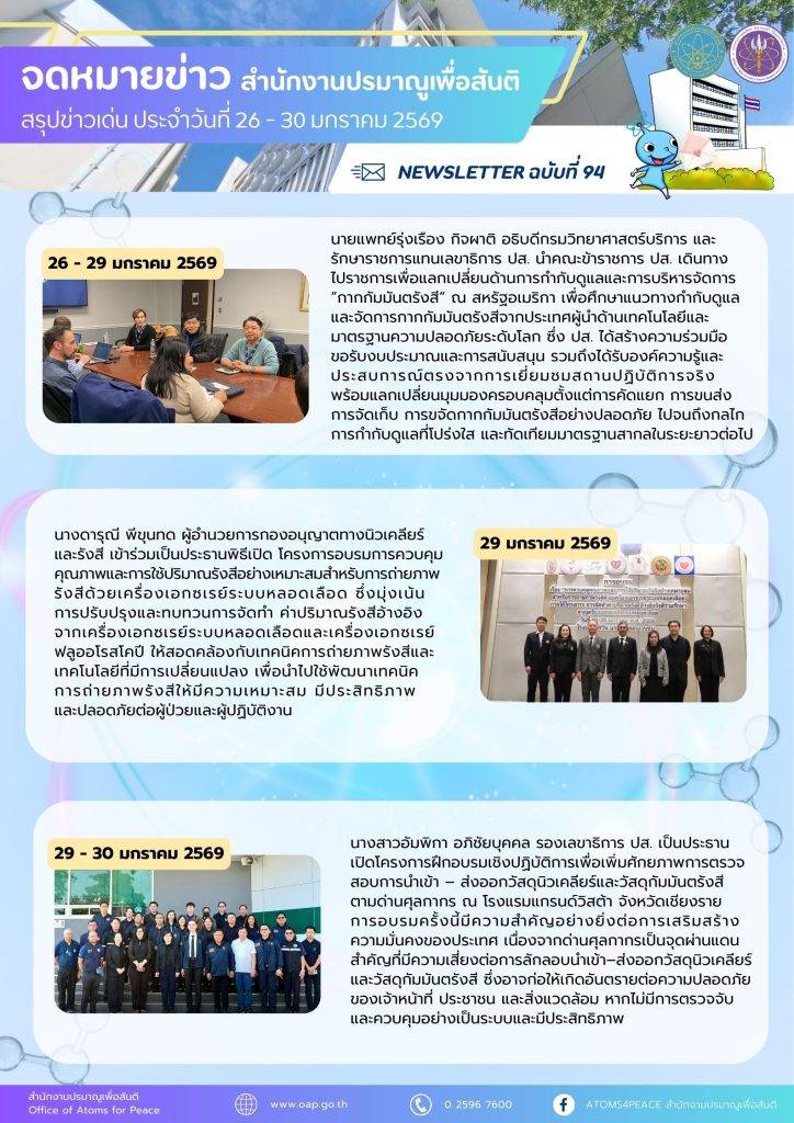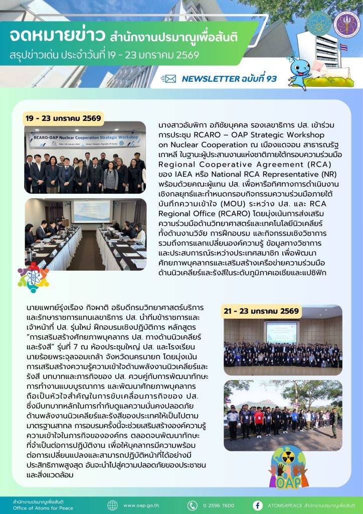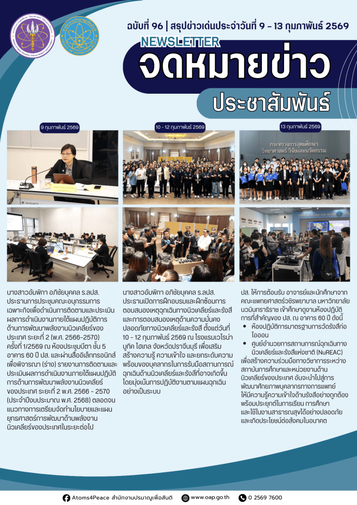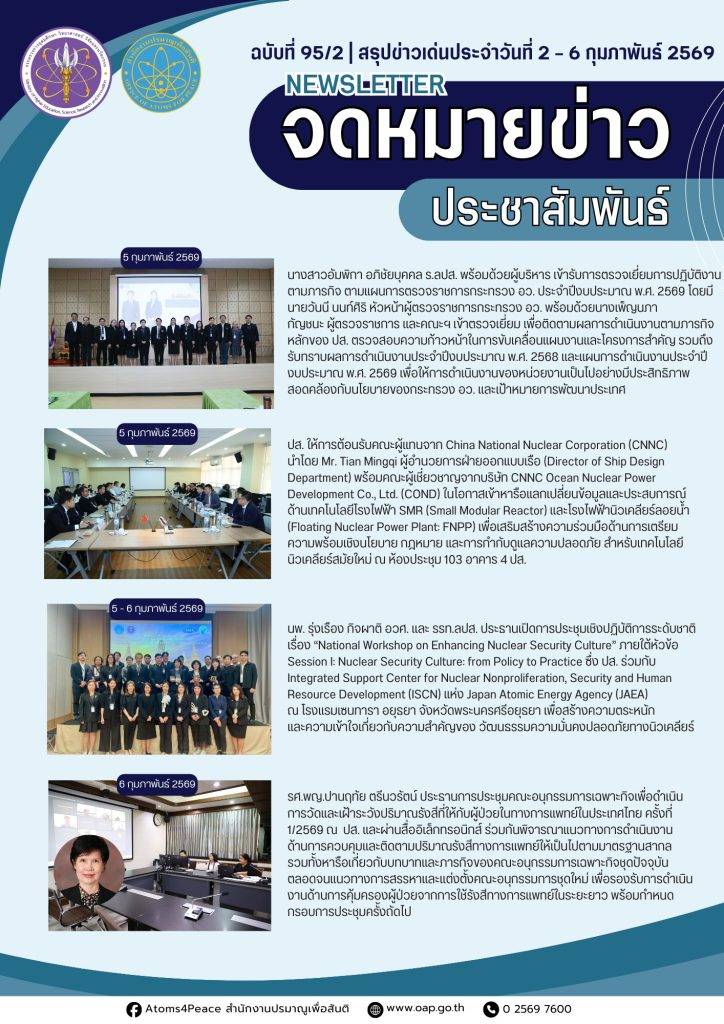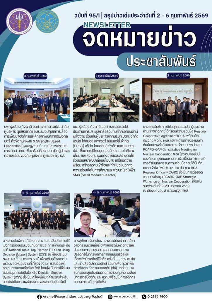 Homeเอกสารเผยแพร่จดหมายข่าวสรุปข่าวเด่นประจำสัปดาห์ จดหมายข่าว สรุปข่าวเด่นประจำสัปดาห์ Search for:Search Button สรุปข่าวเด่นประจำสัปดาห์ ฉบับที่ 98 (23- 27 ก.พ. 2569) 2 มีนาคม 2569 สรุปข่าวเด่นประจำสัปดาห์ ฉบับที่ 97 (16- 20 ก.พ. 2569) 23 กุมภาพันธ์ 2569 สรุปข่าวเด่นประจำสัปดาห์ ฉบับที่ 96 (9- 13 ก.พ. 2569) 16 กุมภาพันธ์ 2569 สรุปข่าวเด่นประจำสัปดาห์ ฉบับที่ 95/2 (2- 6 ก.พ. 2569) 9 กุมภาพันธ์ 2569 สรุปข่าวเด่นประจำสัปดาห์ ฉบับที่ 95/1 (2- 6 ก.พ. 2569) 9 กุมภาพันธ์ 2569 สรุปข่าวเด่นประจำสัปดาห์ ฉบับที่ 94 (26 – 30 ม.ค. 2569) 9 กุมภาพันธ์ 2569 สรุปข่าวเด่นประจำสัปดาห์ ฉบับที่ 93 (19 – 23 ม.ค. 2569) 26 มกราคม 2569 สรุปข่าวเด่นประจำสัปดาห์ ฉบับที่ 92 (12 – 16 ม.ค. 2569) 26 มกราคม 2569 สรุปข่าวเด่นประจำสัปดาห์ ฉบับที่ 91 (5 – 11 ม.ค. 2569) 26 มกราคม 2569 สรุปข่าวเด่นประจำสัปดาห์ ฉบับที่ 90 (22 – 26 ธ.ค. 2568) 29 ธันวาคม 2568 สรุปข่าวเด่นประจำสัปดาห์ ฉบับที่ 89 (15 – 19 ธ.ค. 2568) 29 ธันวาคม 2568 สรุปข่าวเด่นประจำสัปดาห์ ฉบับที่ 88 (8 – 12 ธ.ค. 2568) 15 ธันวาคม 2568 1 2 3 4 5 … 7 8 9 10 Next » กลุ่มมาตรฐานการวัดทางนิวเคลียร์และรังสี กลุ่มเฝ้าตรวจกัมมันตภาพรังสี กลุ่มประเมินค่าปริมาณรังสี กลุ่มพัฒนาด้านความปลอดภัย กลุ่มสนับสนุนทางเทคนิคด้านความมั่นคงและพิทักษ์ความปลอดภัย กลุ่มเลขานุการคณะกรรมการพลังงานนิวเคลียร์เพื่อสันติ ศูนย์ปรมาณูเพื่อสันติภูมิภาค จดหมายข่าวปรมาณูเพื่อสันติ สรุปข่าวเด่นประจำสัปดาห์