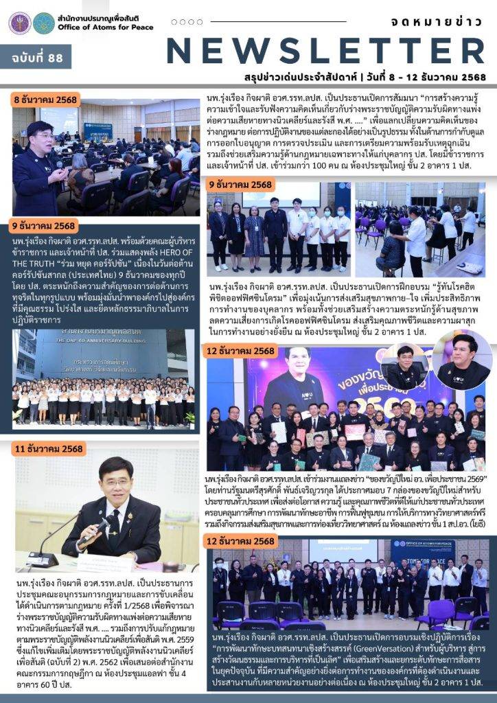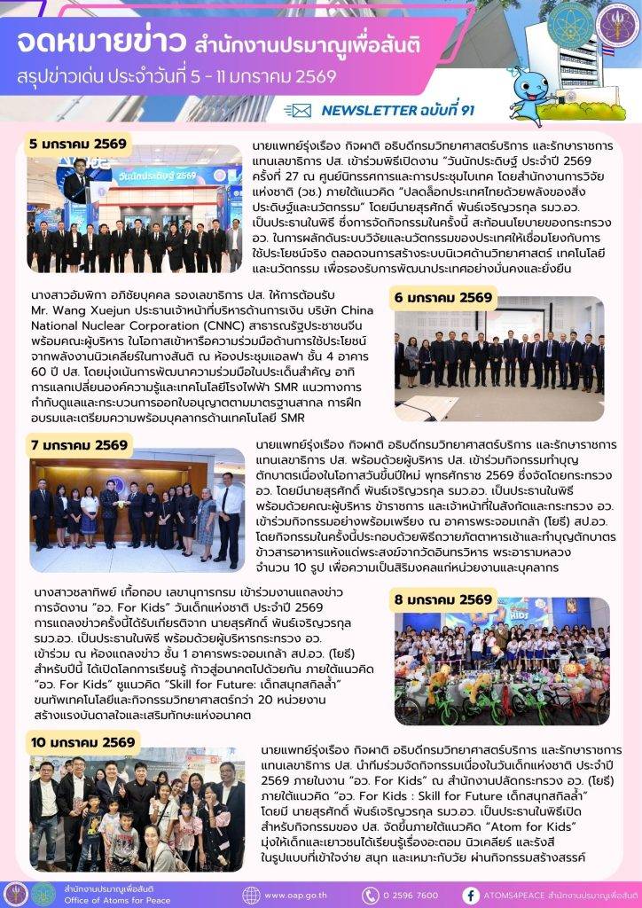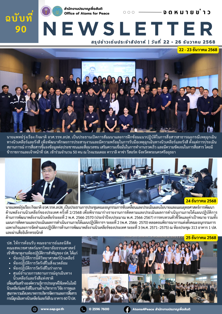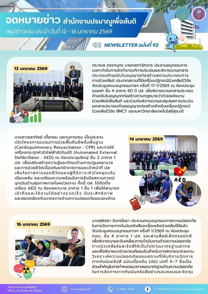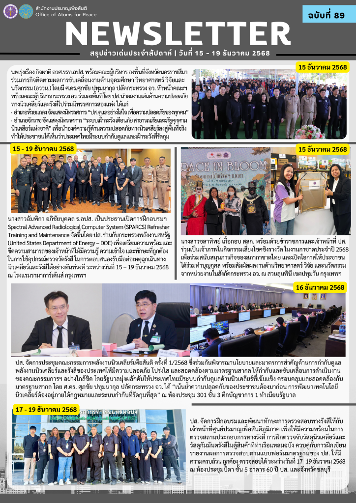 Homeเอกสารเผยแพร่จดหมายข่าวสรุปข่าวเด่นประจำสัปดาห์ จดหมายข่าว สรุปข่าวเด่นประจำสัปดาห์ Search for:Search Button สรุปข่าวเด่นประจำสัปดาห์ ฉบับที่ 98 (23- 27 ก.พ. 2569) 2 มีนาคม 2569 สรุปข่าวเด่นประจำสัปดาห์ ฉบับที่ 97 (16- 20 ก.พ. 2569) 23 กุมภาพันธ์ 2569 สรุปข่าวเด่นประจำสัปดาห์ ฉบับที่ 96 (9- 13 ก.พ. 2569) 16 กุมภาพันธ์ 2569 สรุปข่าวเด่นประจำสัปดาห์ ฉบับที่ 95/2 (2- 6 ก.พ. 2569) 9 กุมภาพันธ์ 2569 สรุปข่าวเด่นประจำสัปดาห์ ฉบับที่ 95/1 (2- 6 ก.พ. 2569) 9 กุมภาพันธ์ 2569 สรุปข่าวเด่นประจำสัปดาห์ ฉบับที่ 94 (26 – 30 ม.ค. 2569) 9 กุมภาพันธ์ 2569 สรุปข่าวเด่นประจำสัปดาห์ ฉบับที่ 93 (19 – 23 ม.ค. 2569) 26 มกราคม 2569 สรุปข่าวเด่นประจำสัปดาห์ ฉบับที่ 92 (12 – 16 ม.ค. 2569) 26 มกราคม 2569 สรุปข่าวเด่นประจำสัปดาห์ ฉบับที่ 91 (5 – 11 ม.ค. 2569) 26 มกราคม 2569 สรุปข่าวเด่นประจำสัปดาห์ ฉบับที่ 90 (22 – 26 ธ.ค. 2568) 29 ธันวาคม 2568 สรุปข่าวเด่นประจำสัปดาห์ ฉบับที่ 89 (15 – 19 ธ.ค. 2568) 29 ธันวาคม 2568 สรุปข่าวเด่นประจำสัปดาห์ ฉบับที่ 88 (8 – 12 ธ.ค. 2568) 15 ธันวาคม 2568 1 2 3 4 5 … 7 8 9 10 Next » กลุ่มมาตรฐานการวัดทางนิวเคลียร์และรังสี กลุ่มเฝ้าตรวจกัมมันตภาพรังสี กลุ่มประเมินค่าปริมาณรังสี กลุ่มพัฒนาด้านความปลอดภัย กลุ่มสนับสนุนทางเทคนิคด้านความมั่นคงและพิทักษ์ความปลอดภัย กลุ่มเลขานุการคณะกรรมการพลังงานนิวเคลียร์เพื่อสันติ ศูนย์ปรมาณูเพื่อสันติภูมิภาค จดหมายข่าวปรมาณูเพื่อสันติ สรุปข่าวเด่นประจำสัปดาห์