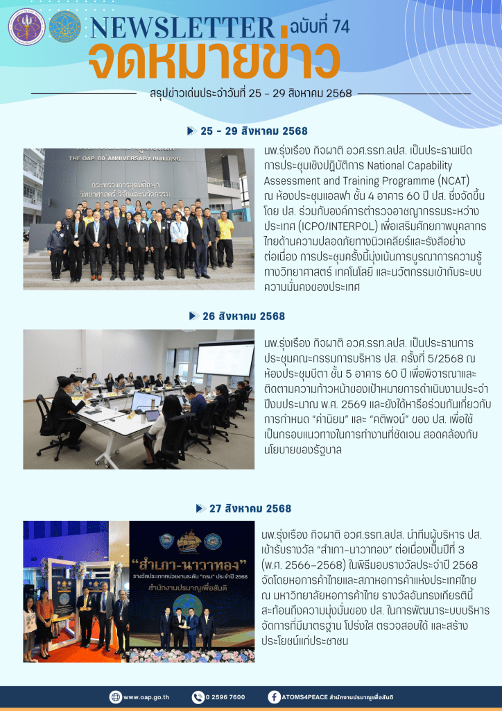 Homeเอกสารเผยแพร่จดหมายข่าวสรุปข่าวเด่นประจำสัปดาห์Page 3 จดหมายข่าว สรุปข่าวเด่นประจำสัปดาห์ Search for:Search Button สรุปข่าวเด่นประจำสัปดาห์ ฉบับที่ 80 (13 – 19 ต.ค. 2568) 20 ตุลาคม 2568 สรุปข่าวเด่นประจำสัปดาห์ ฉบับที่ 79 (6 – 10 ต.ค. 2568) 20 ตุลาคม 2568 สรุปข่าวเด่นประจำสัปดาห์ ฉบับที่ 78 (29 ก.ย. – 3 ต.ค. 2568) 3 ตุลาคม 2568 สรุปข่าวเด่นประจำสัปดาห์ ฉบับที่ 77/2 (15 – 19 ก.ย. 2568) 22 กันยายน 2568 สรุปข่าวเด่นประจำสัปดาห์ ฉบับที่ 77/1 (15 – 19 ก.ย. 2568) 22 กันยายน 2568 สรุปข่าวเด่นประจำสัปดาห์ ฉบับที่ 76 (8 – 12 ก.ย. 2568) 15 กันยายน 2568 สรุปข่าวเด่นประจำสัปดาห์ ฉบับที่ 75 (1 – 5 ก.ย. 2568) 8 กันยายน 2568 สรุปข่าวเด่นประจำสัปดาห์ ฉบับที่ 74 (25 – 29 ส.ค. 2568) 1 กันยายน 2568 สรุปข่าวเด่นประจำสัปดาห์ ฉบับที่ 73 (18 – 22 ส.ค. 2568) 28 สิงหาคม 2568 สรุปข่าวเด่นประจำสัปดาห์ ฉบับที่ 72 (11 – 17 ส.ค. 2568) 28 สิงหาคม 2568 สรุปข่าวเด่นประจำสัปดาห์ ฉบับที่ 71 (4 – 9 ส.ค. 2568) 28 สิงหาคม 2568 สรุปข่าวเด่นประจำสัปดาห์ ฉบับที่ 70 (28 ก.ค. – 1 ส.ต. 2568) 5 สิงหาคม 2568 « Previous 1 2 3 4 5 6 7 8 9 10 Next » กลุ่มมาตรฐานการวัดทางนิวเคลียร์และรังสี กลุ่มเฝ้าตรวจกัมมันตภาพรังสี กลุ่มประเมินค่าปริมาณรังสี กลุ่มพัฒนาด้านความปลอดภัย กลุ่มสนับสนุนทางเทคนิคด้านความมั่นคงและพิทักษ์ความปลอดภัย กลุ่มเลขานุการคณะกรรมการพลังงานนิวเคลียร์เพื่อสันติ ศูนย์ปรมาณูเพื่อสันติภูมิภาค จดหมายข่าวปรมาณูเพื่อสันติ สรุปข่าวเด่นประจำสัปดาห์